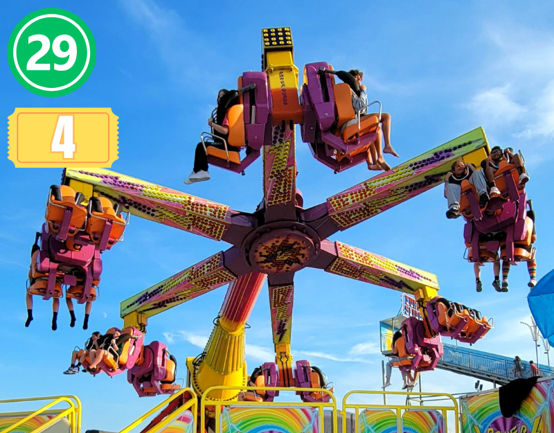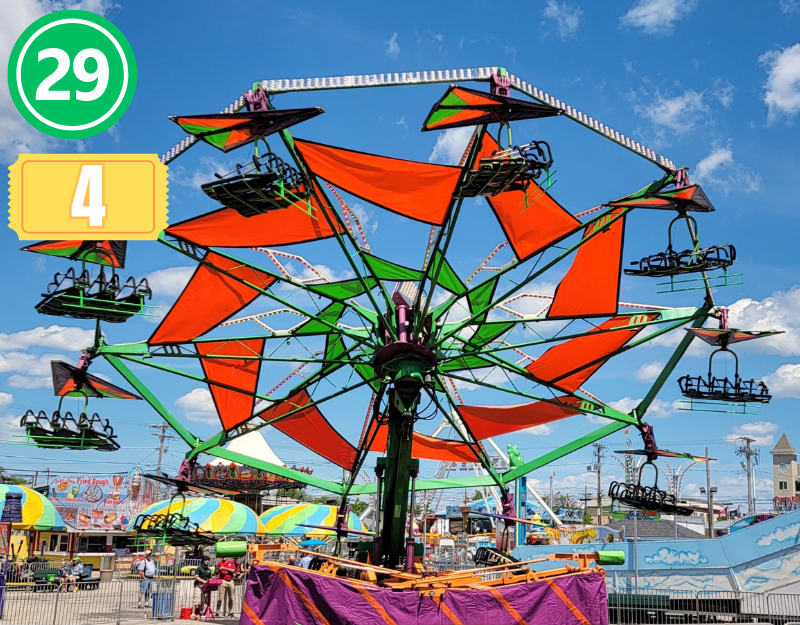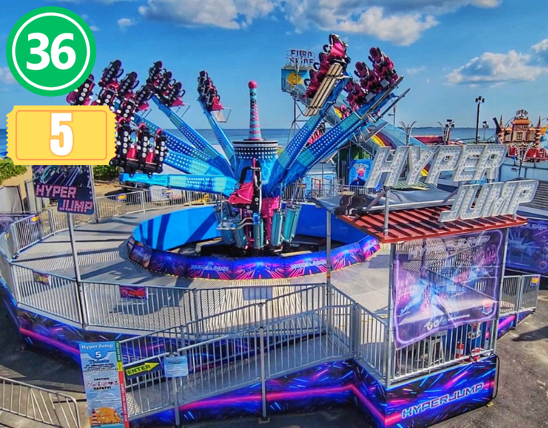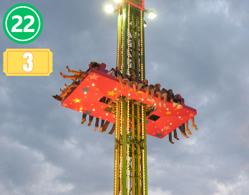 Power Surge is a high-impact thrill ride. Riders are restrained by an over-the-shoulder harness, with their legs dangling free for excitement. The ride begins to rotate as the main arm is raised to an angle of seventy degrees from the platform. The seat your in will spin every way imaginable, including upside down!
